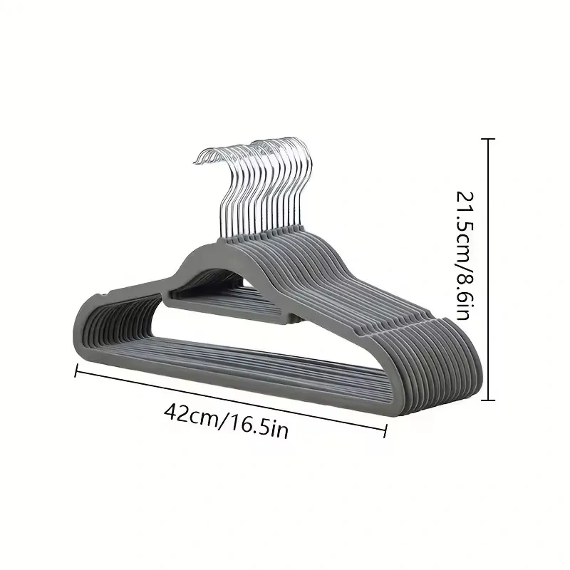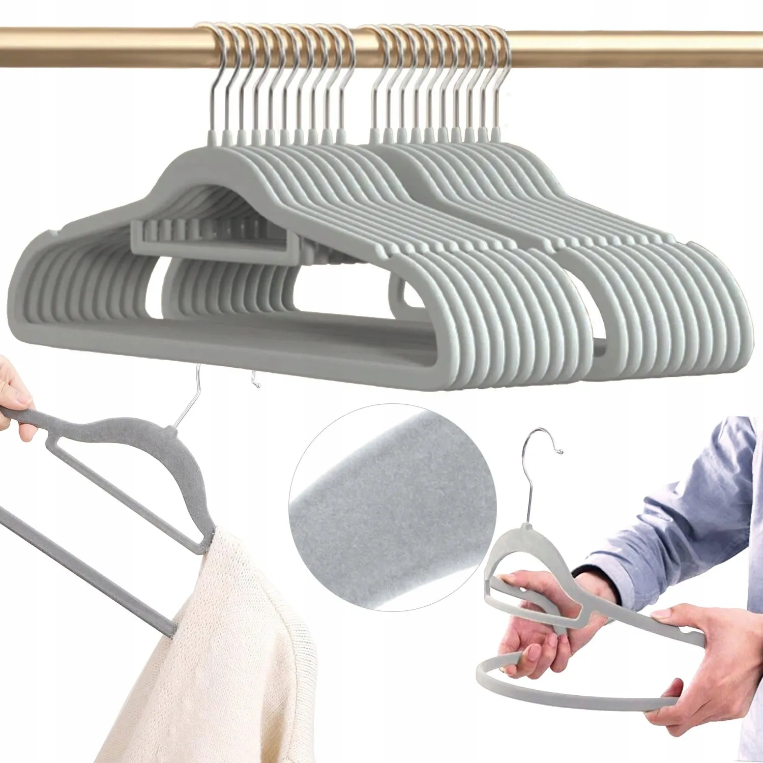 Zestaw 20 eleganckich wieszaków premium pokrytych delikatnym welurem w kolorze szarym.