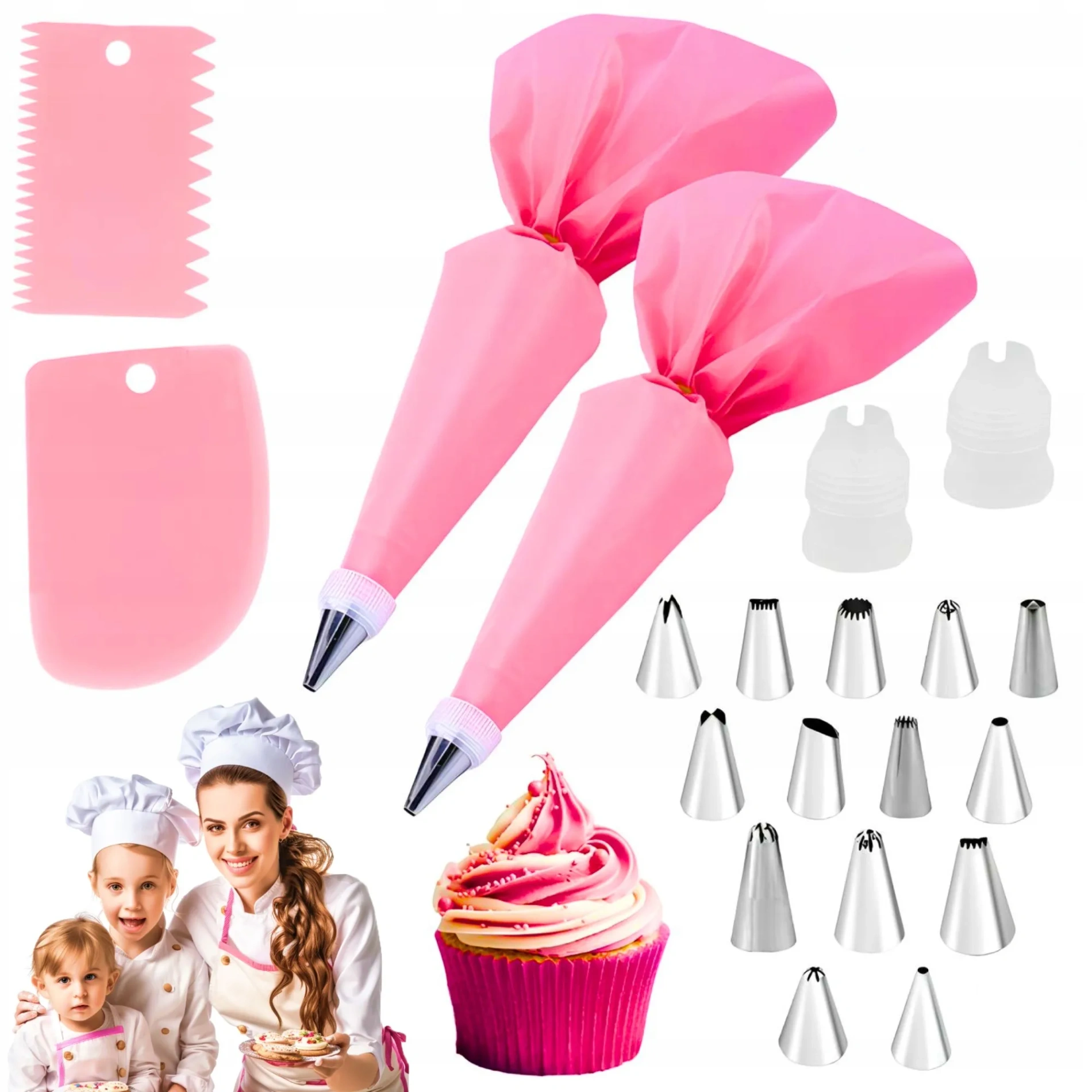 Znajdują się w nim zarówno końcówki do wyciskania kremów i musów, jak i takie, które umożliwiają tworzenie falbanek, kwiatów, listków i innych ozdób.