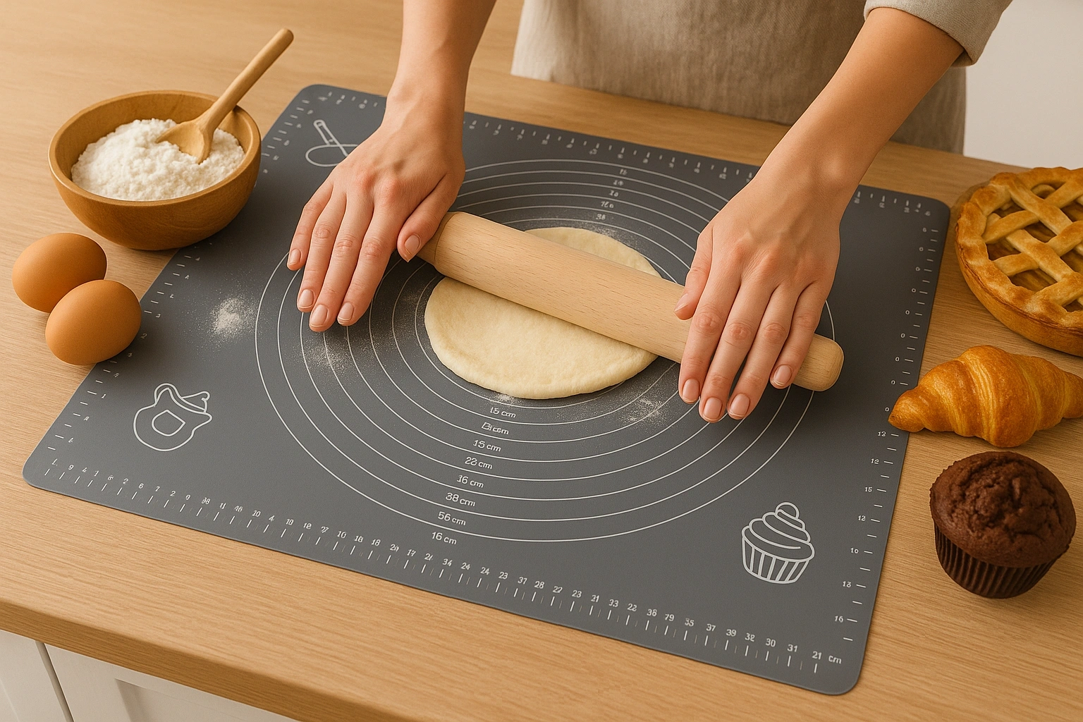 Nowoczesna, zwijana mata silikonowa, z jednej strony mamy powłokę zapobiegającą przywieraniu, z drugiej strony świetnie trzyma się blatu zapobiegając przesuwaniu maty.