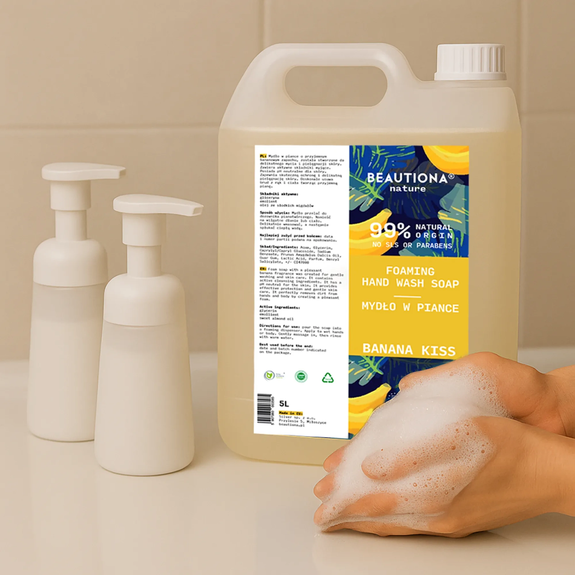 Nasze mydło zmienia się w delikatną, gęstą piankę, która otula Twoje dłonie, zapewniając wyjątkowe doznania sensoryczne.