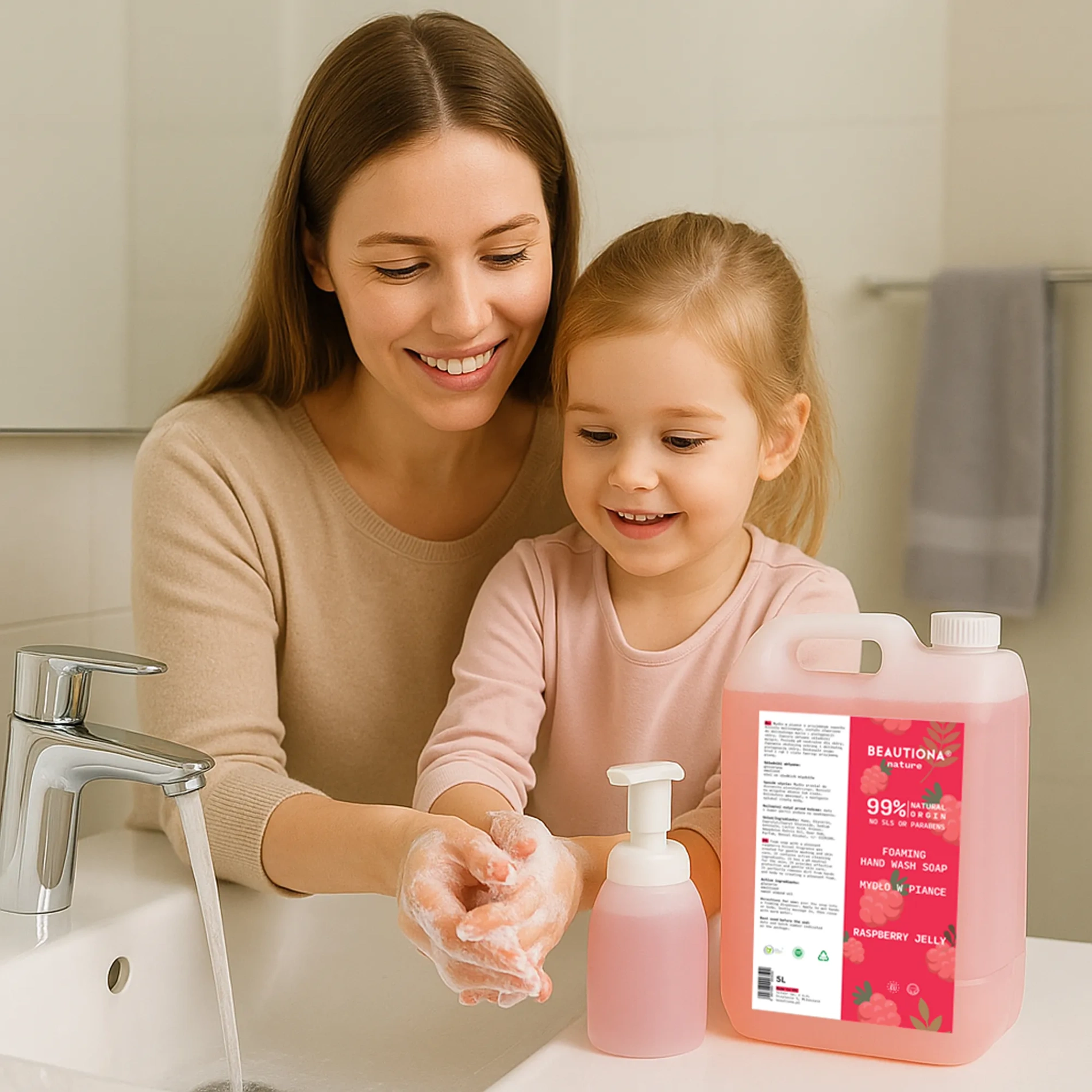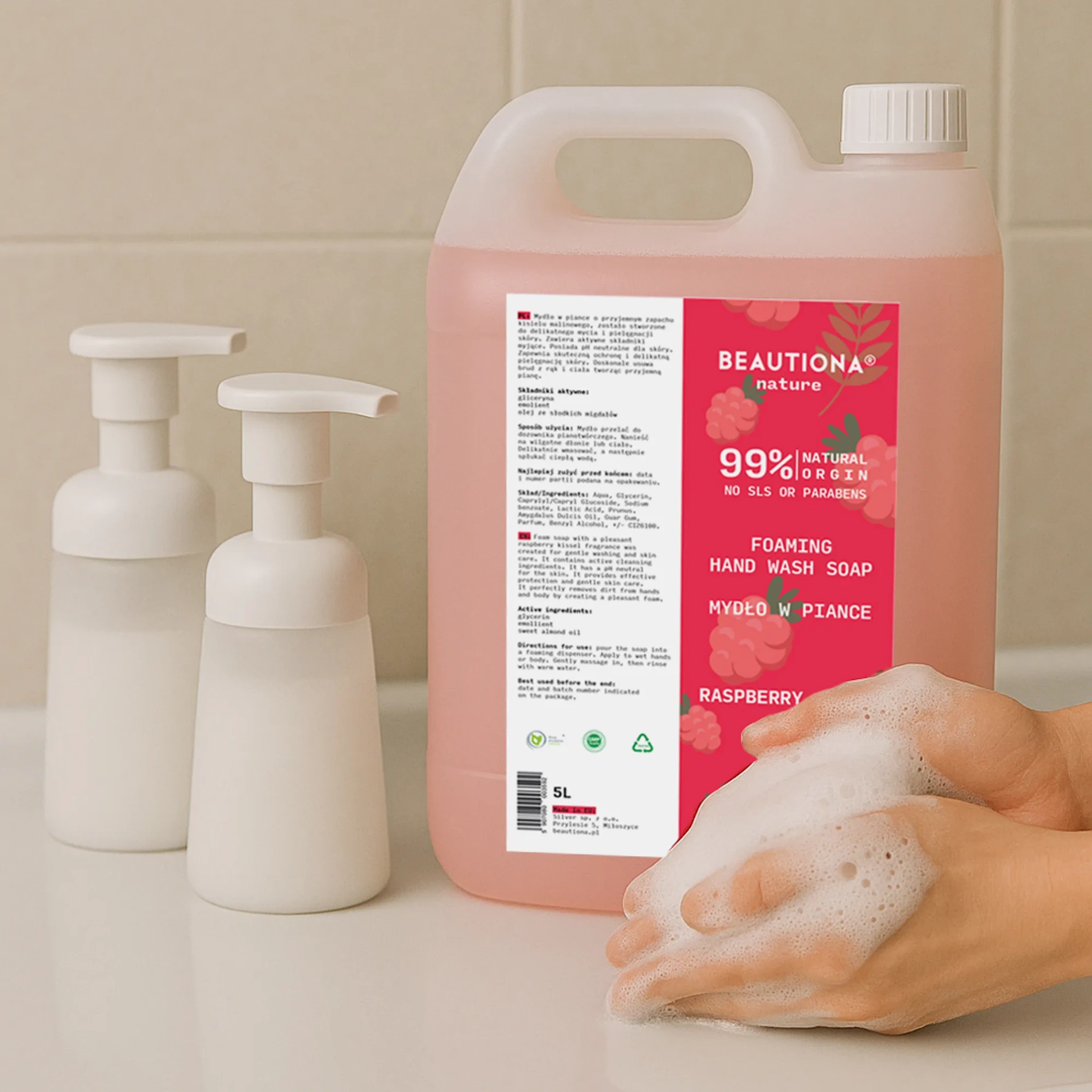 Nasze mydło zmienia się w delikatną, gęstą piankę, która otula Twoje dłonie, zapewniając wyjątkowe doznania sensoryczne.