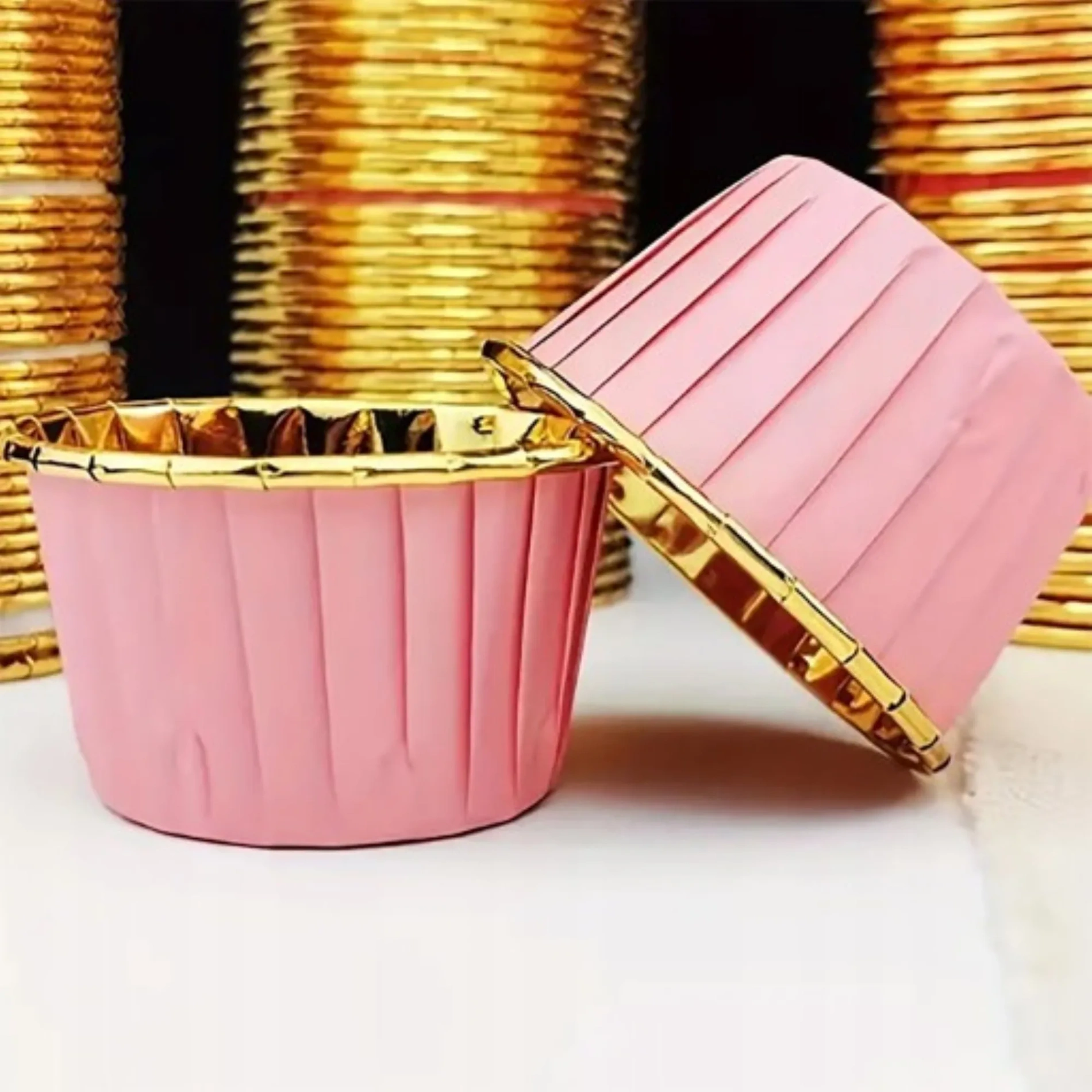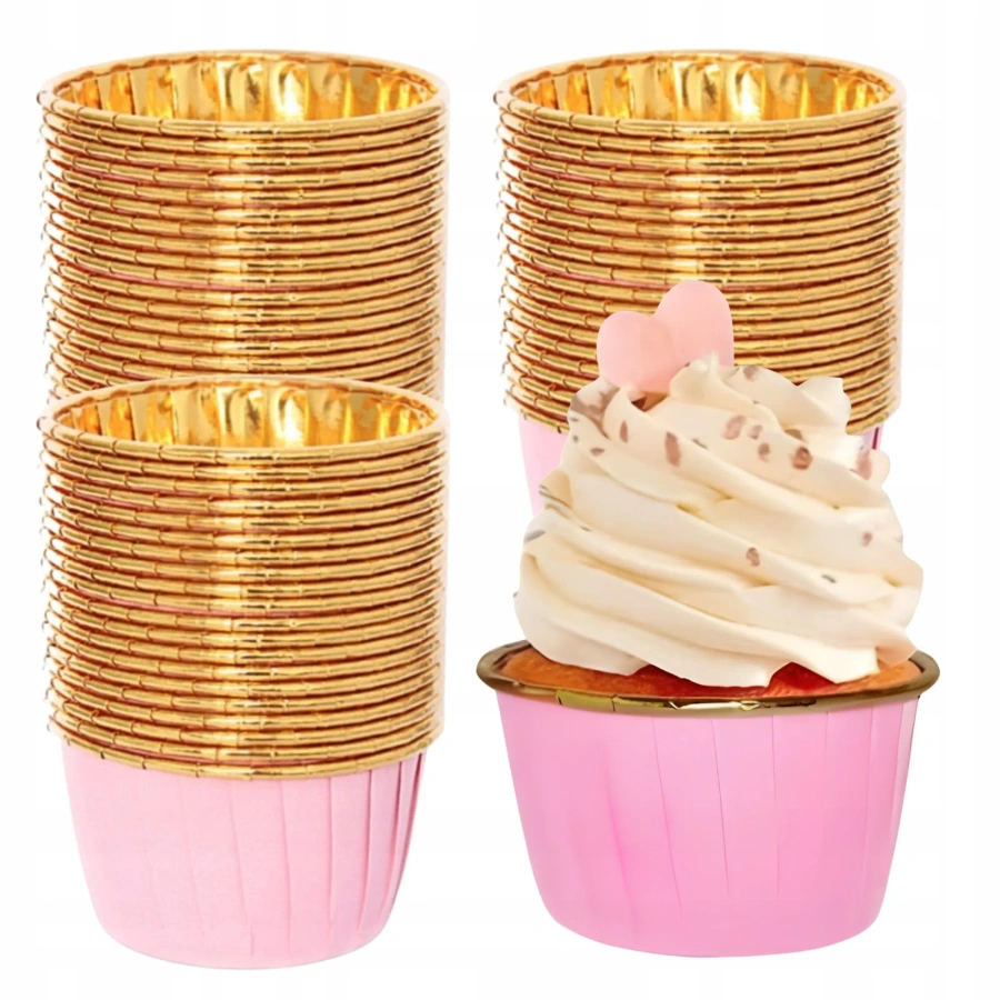 Przygotuj piękne, puszyste muffinki i babeczki dzięki zestawowi 50 sztuk aluminiowych papilotek w eleganckich kolorach złotym i różowym.