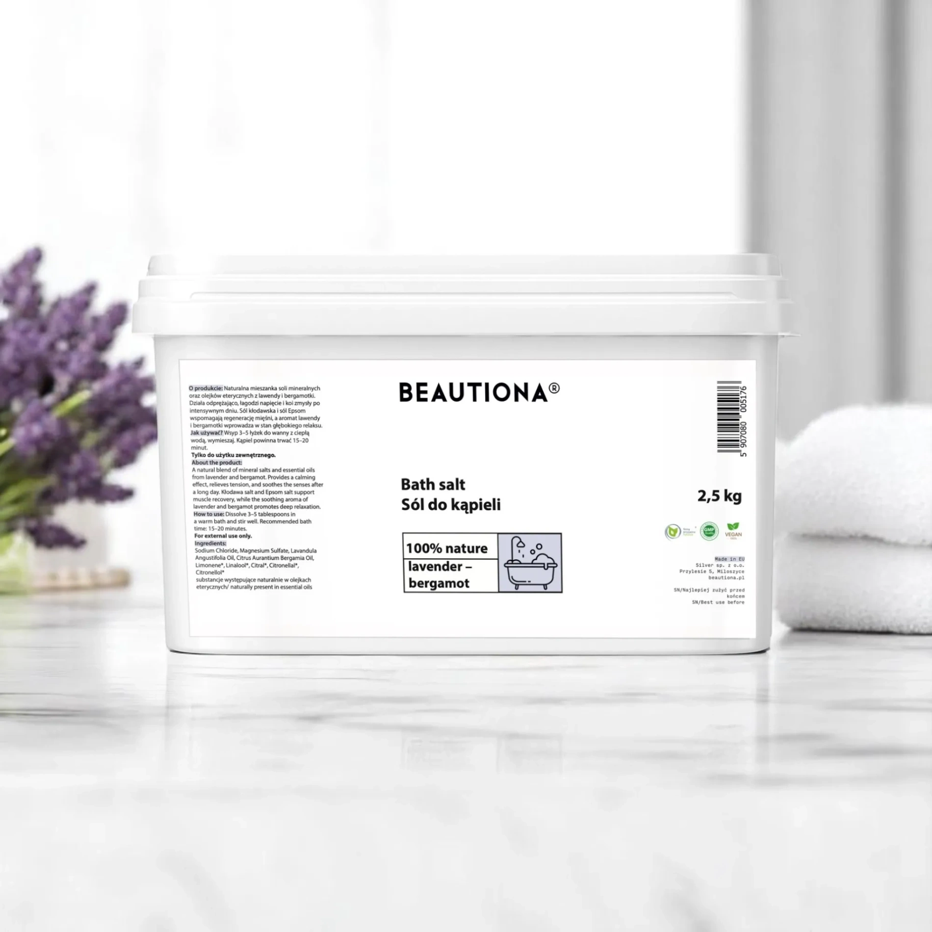 Zanurz się w kojącej kąpieli z naturalną solą do kąpieli o zapachu lawendy i bergamotki.