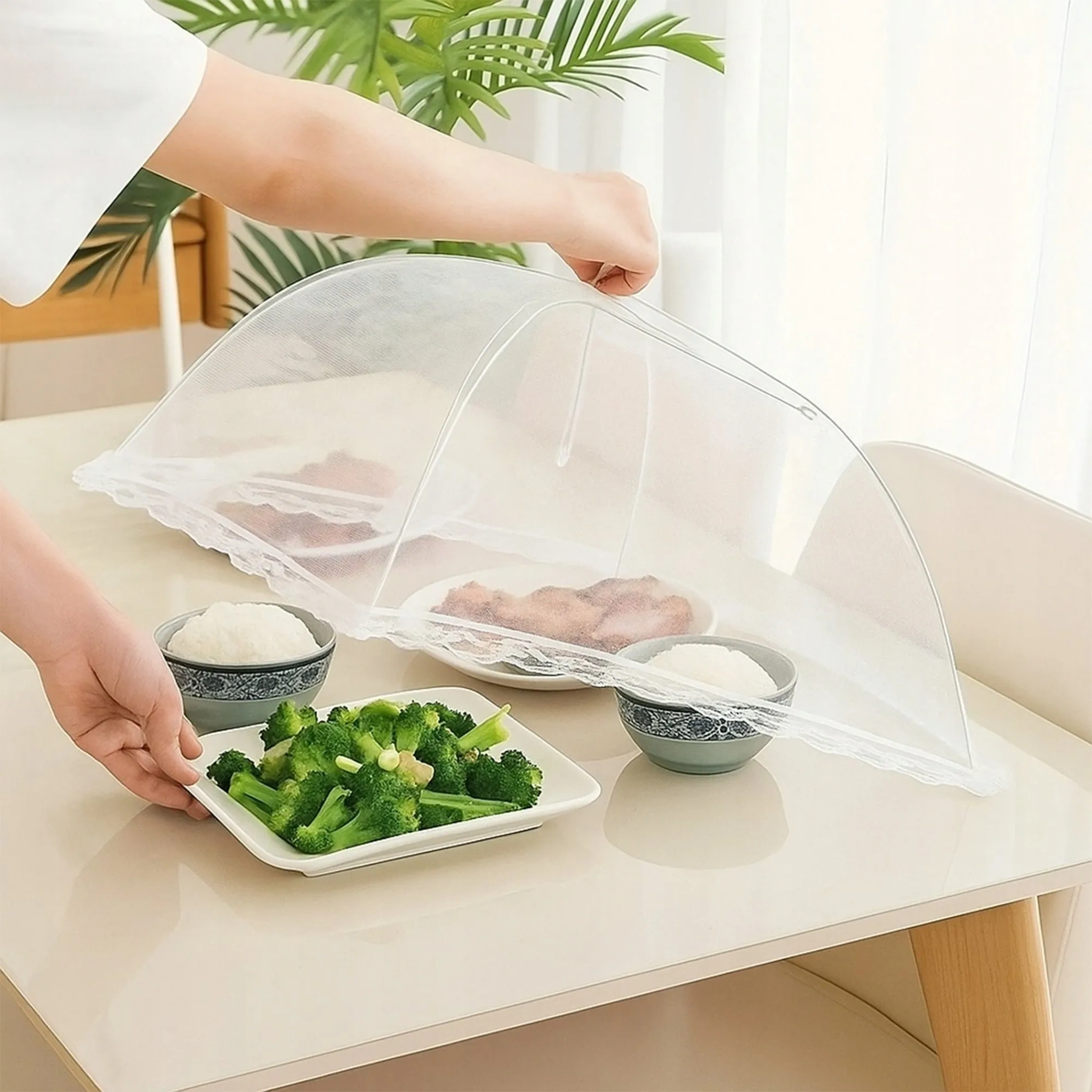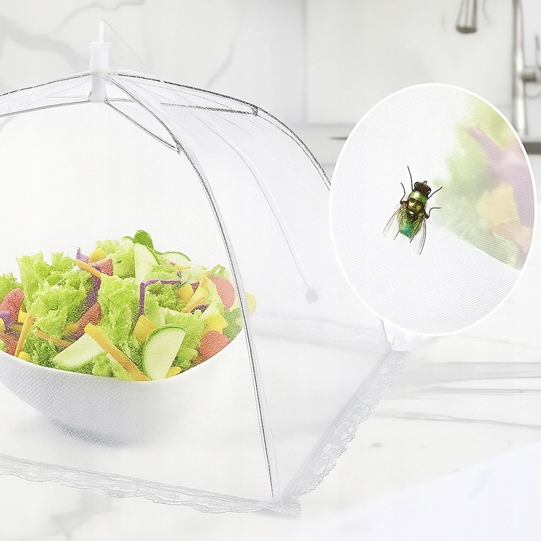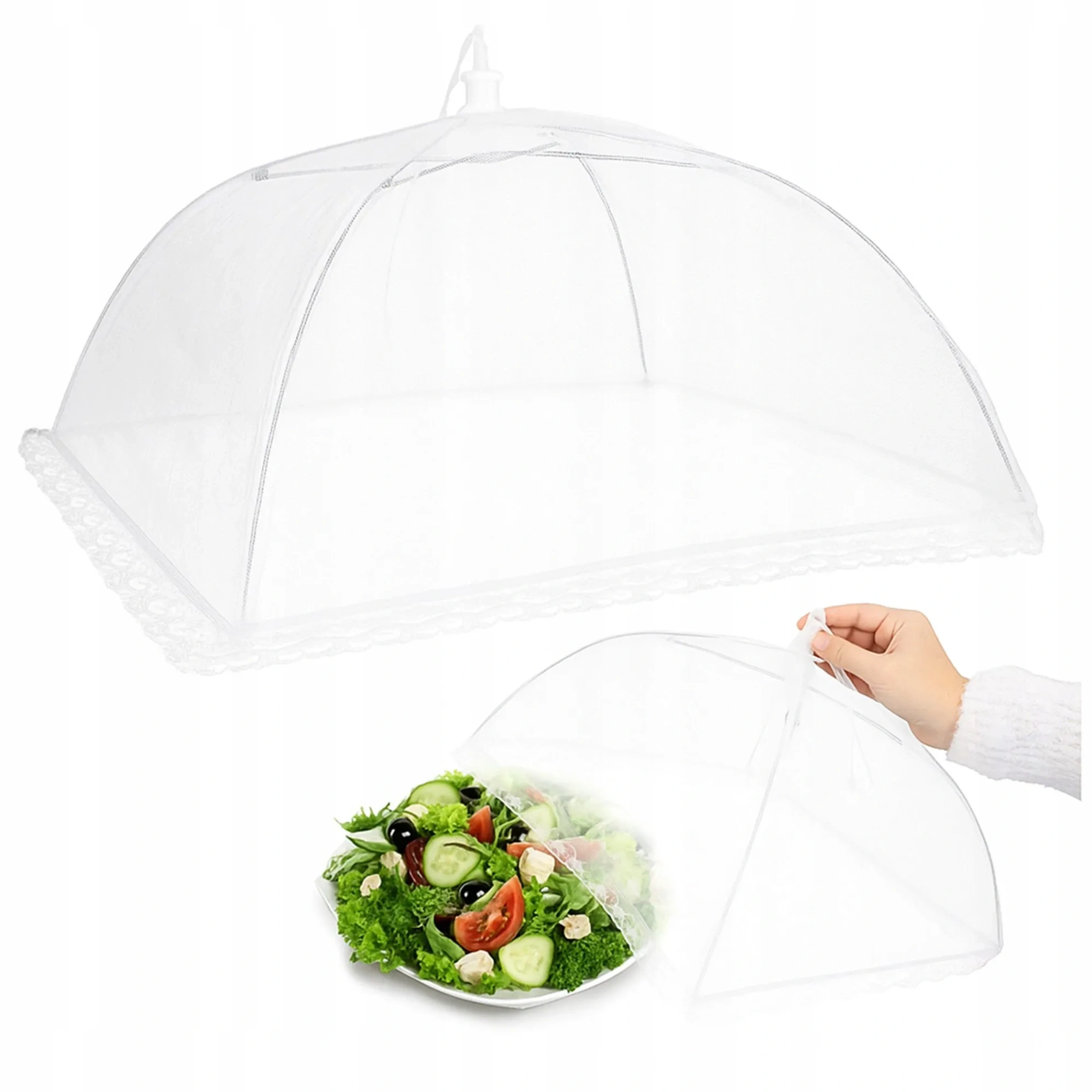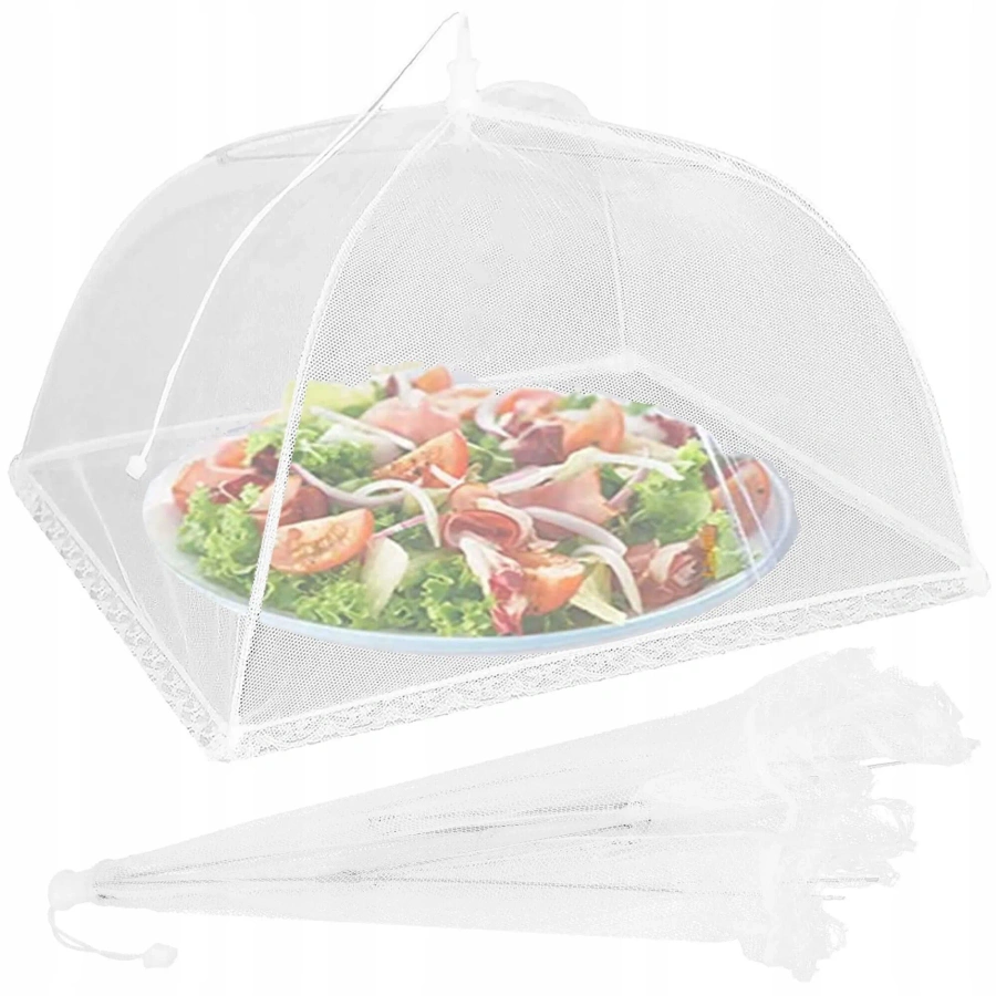 Praktyczna, składana moskitiera na jedzenie, która skutecznie zabezpiecza potrawy, ciasta, owoce oraz napoje przed muchami, osami, komarami, pyłem i innymi zanieczyszczeniami.