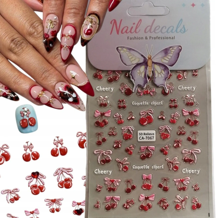 Naklejki 3D do paznokci z motywem wiśni to szybki i prosty sposób na stworzenie efektownego manicure.