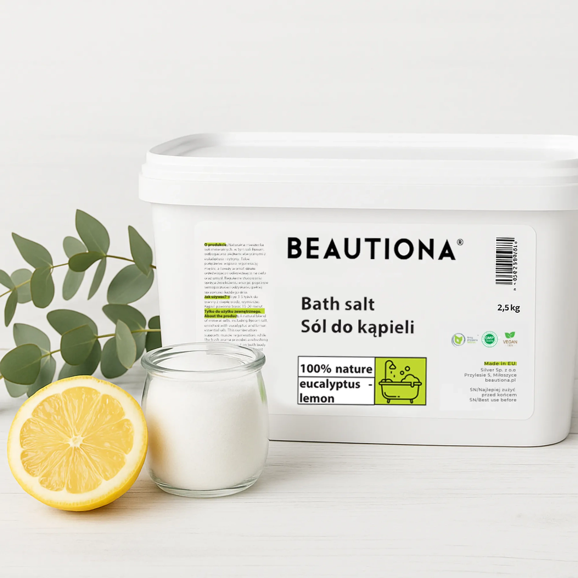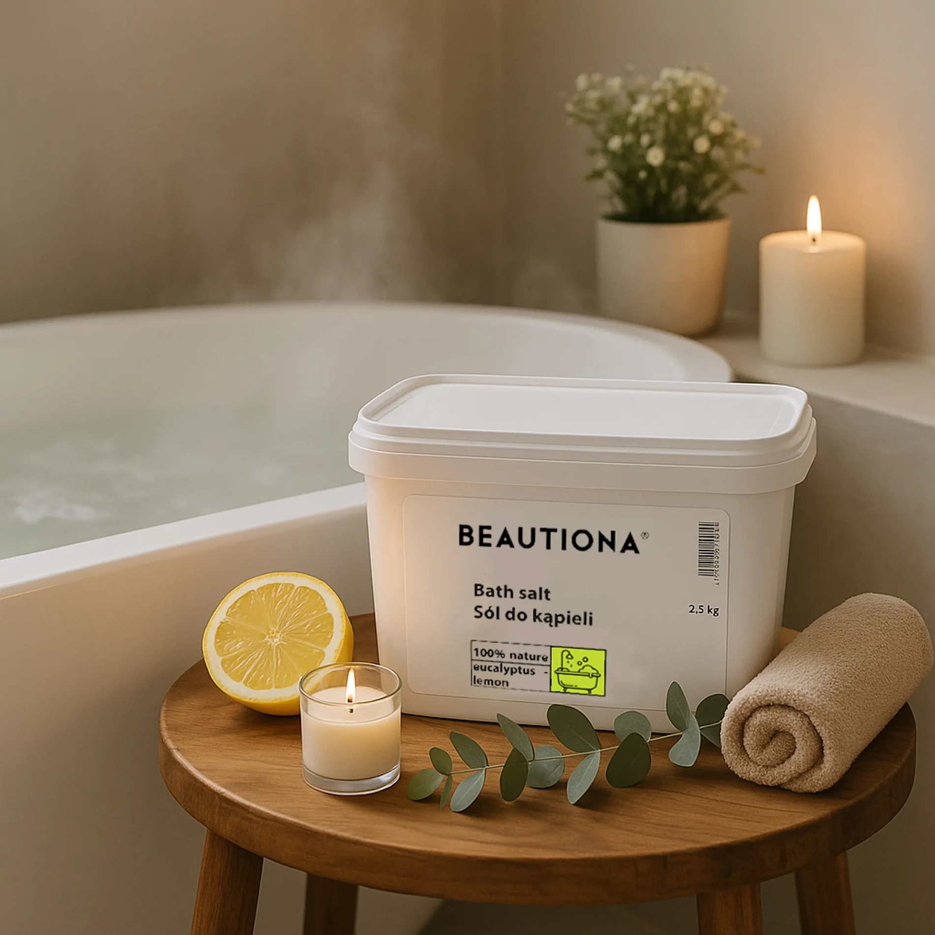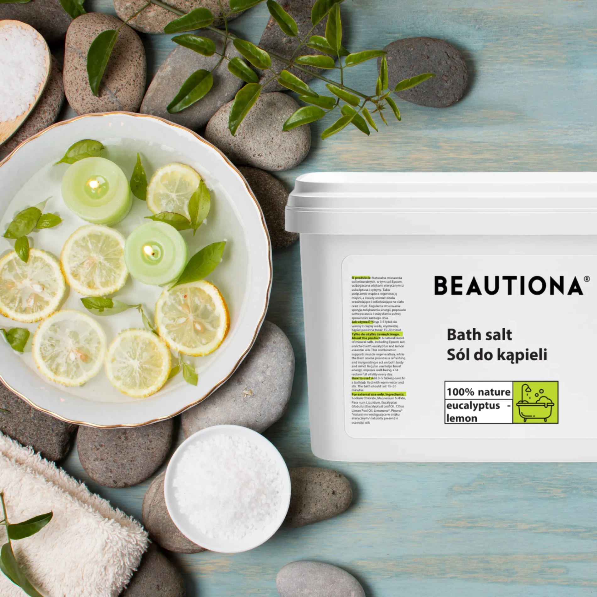 Zrelaksuj się i odśwież swoje ciało, zanurzając się w aromatycznej kąpieli z dodatkiem naturalnej soli o zapachu eukaliptusa i cytryny.