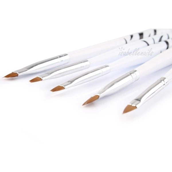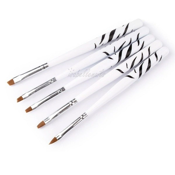 Pędzelki posiadają rożne długości i szerokości włosia co ułatwia precyzyjną aplikację żelu. Posiadają lakierowany biały trzonek zdobiony motywem zebry, o ergonomicznym kształcie który ułatwia pracę. Bardzo łatwe w pielęgnacji, posiadają trwałe i wytrzymałe włosie.