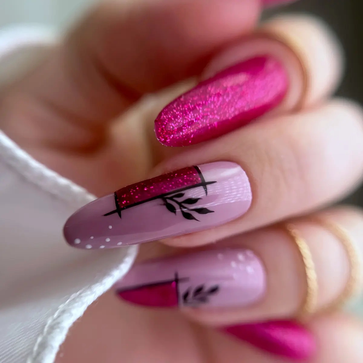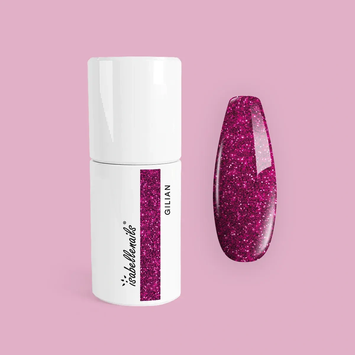 Lakier hybrydowy 62. Gilian to intensywny róż z nutą ekstrawagancji dzięki delikatnemu brokatowi, który nadaje mu wyjątkowego blasku.