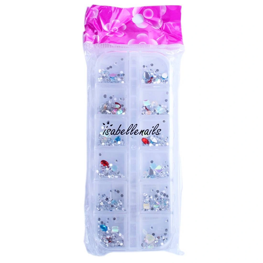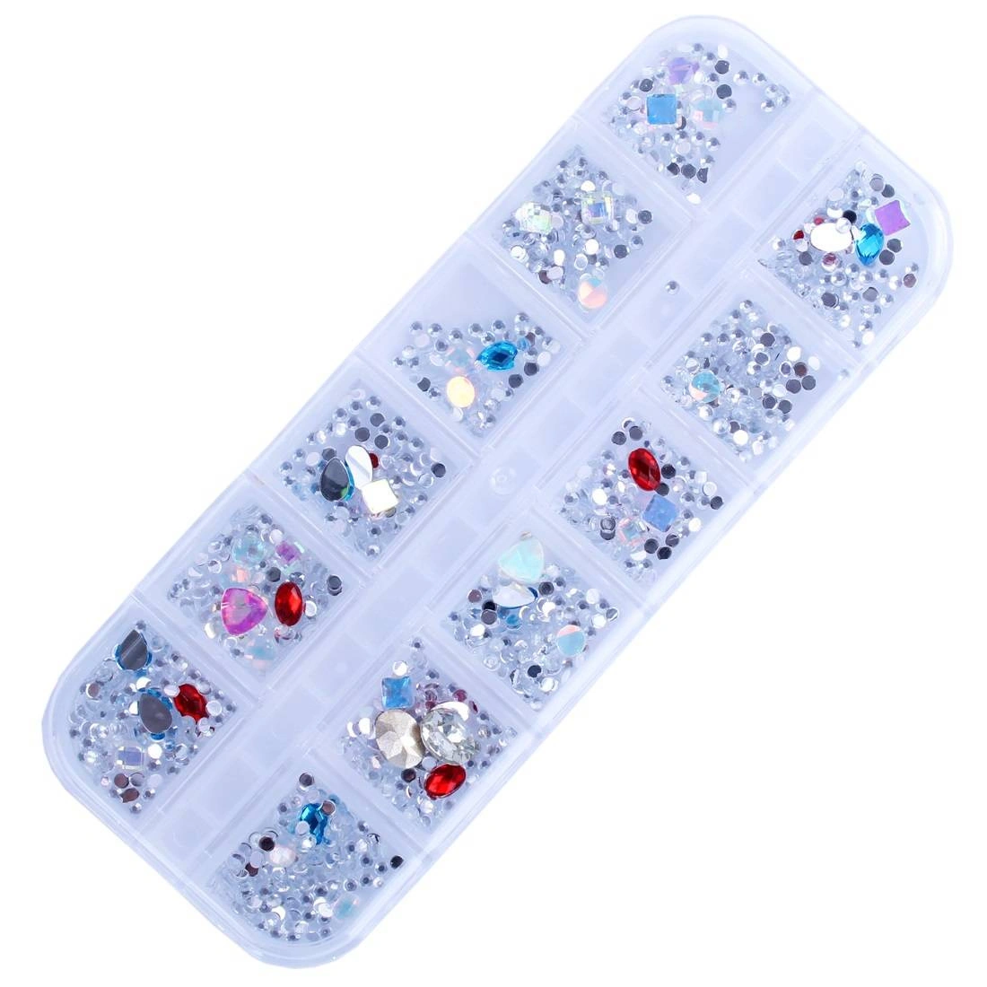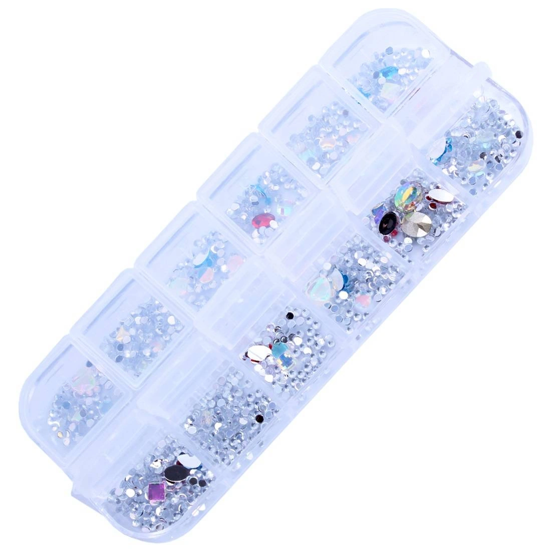 Zestaw zawiera cyrkonie w 12 różnych kolorach i kształtach.