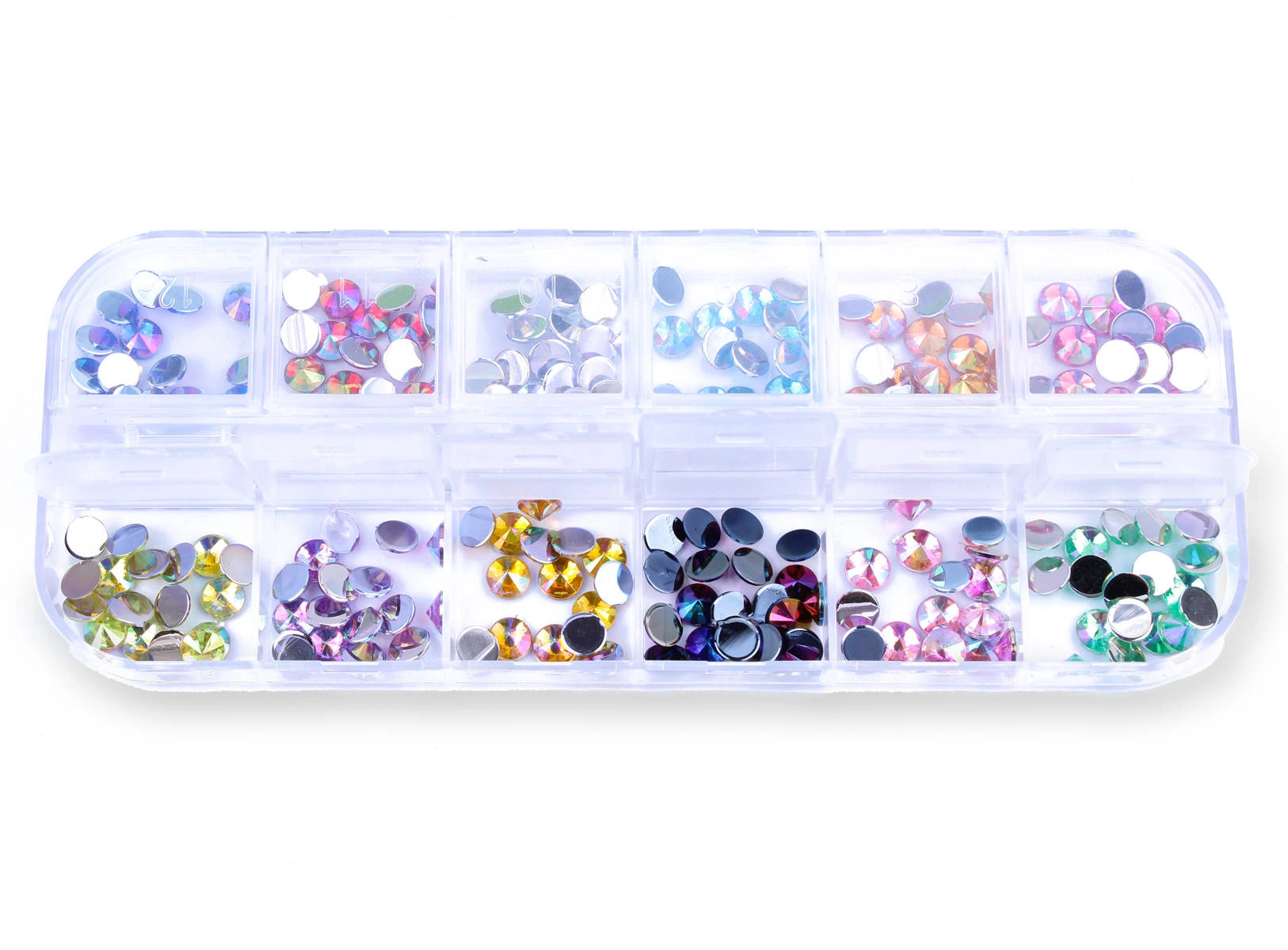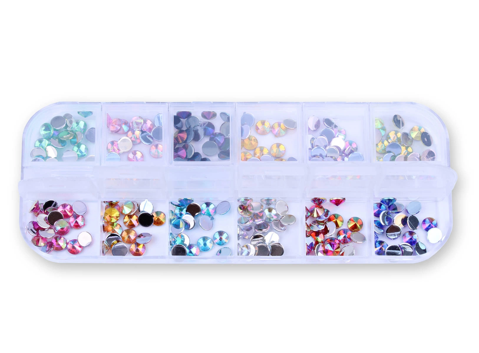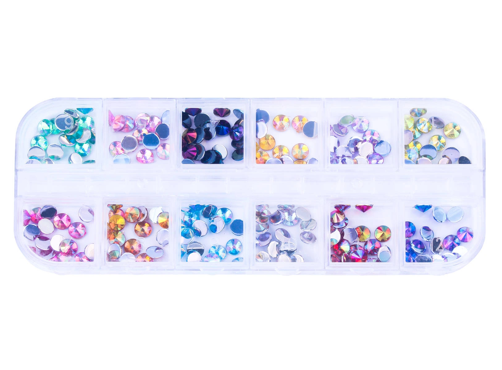 Zestaw ozdób do paznokci stożkowe dżety holo 12 kolorów - kasetka
