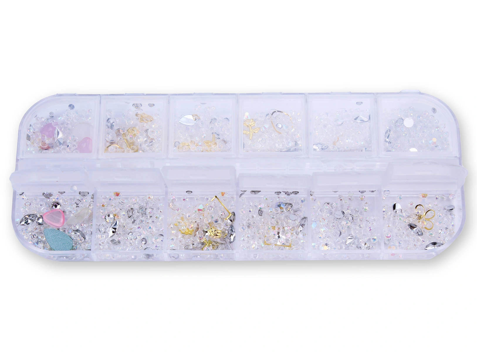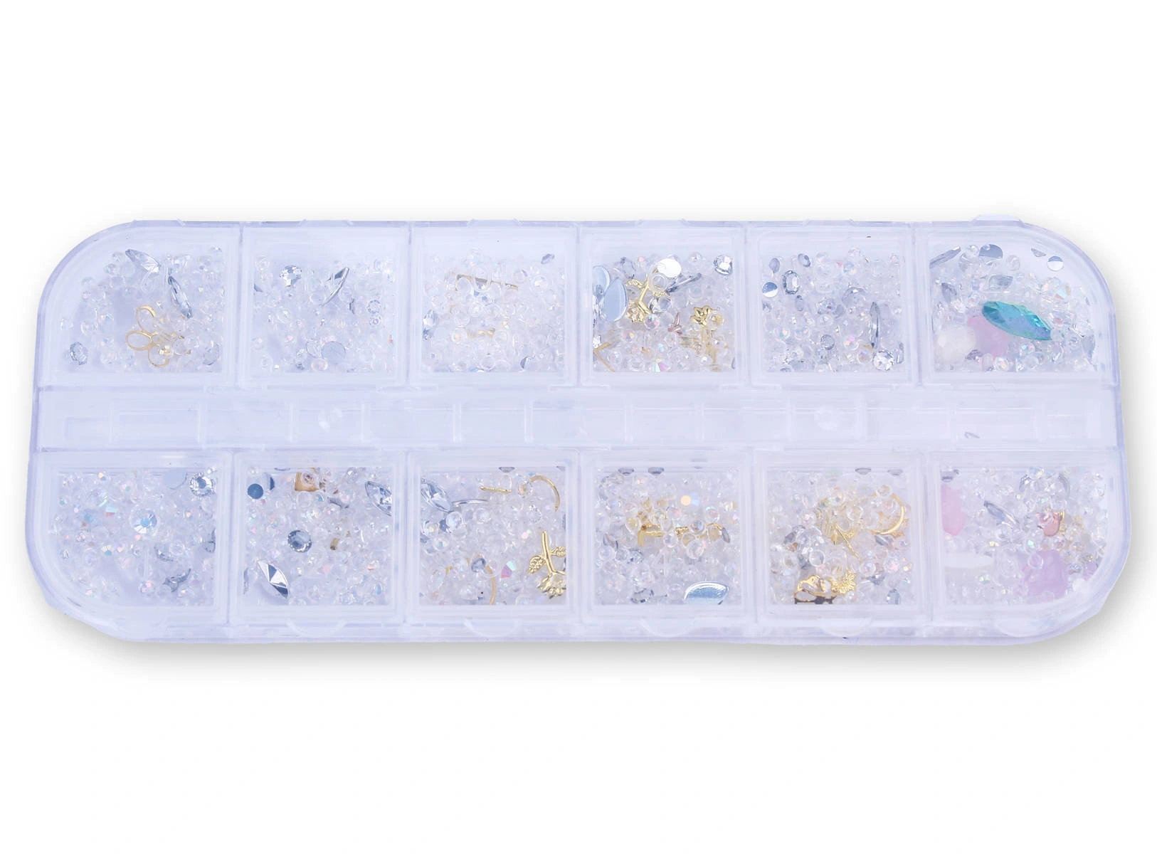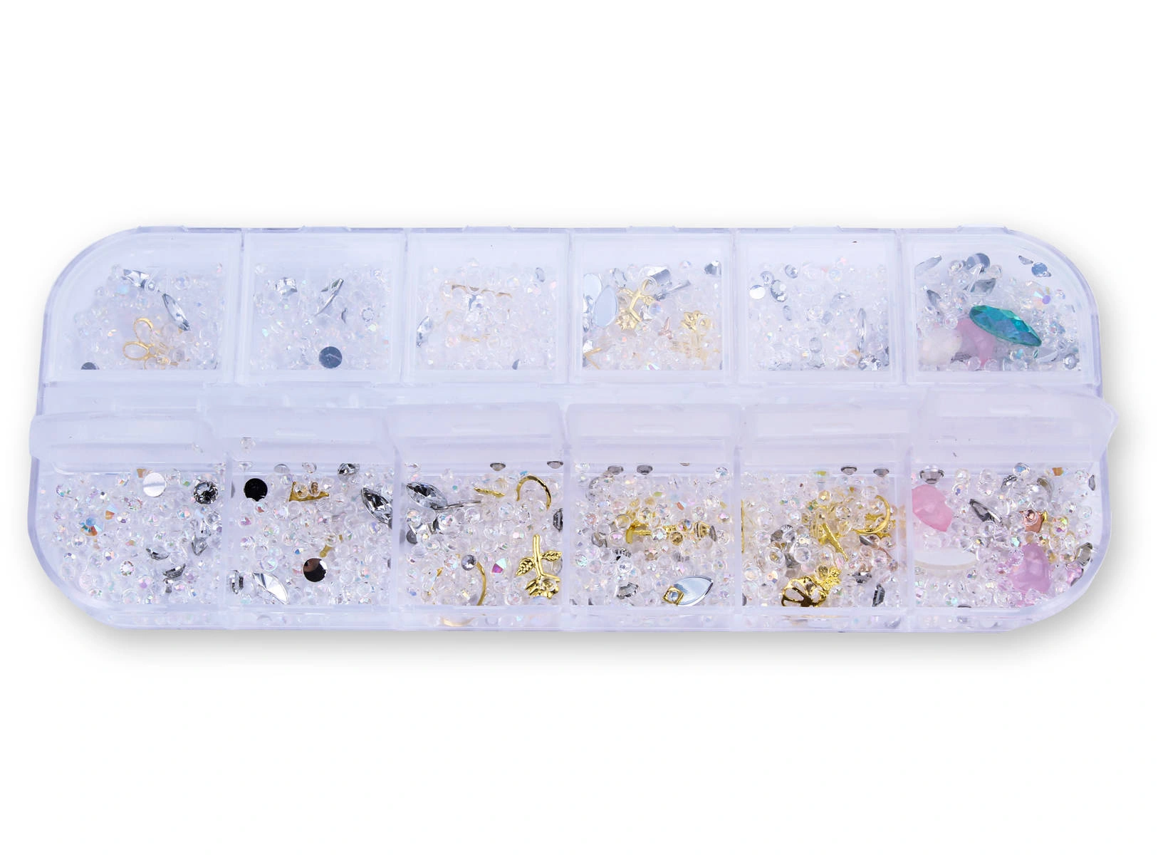 Zestaw zawiera 12 przegródek z ozdobami, m.in. kryształkami, cyrkoniami, złotymi elementami.