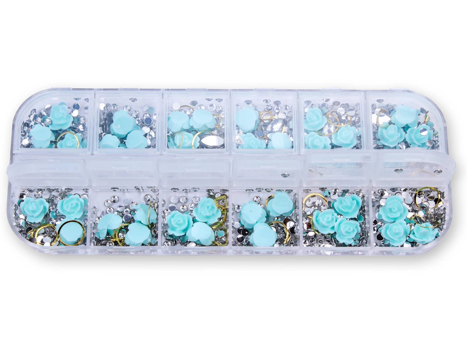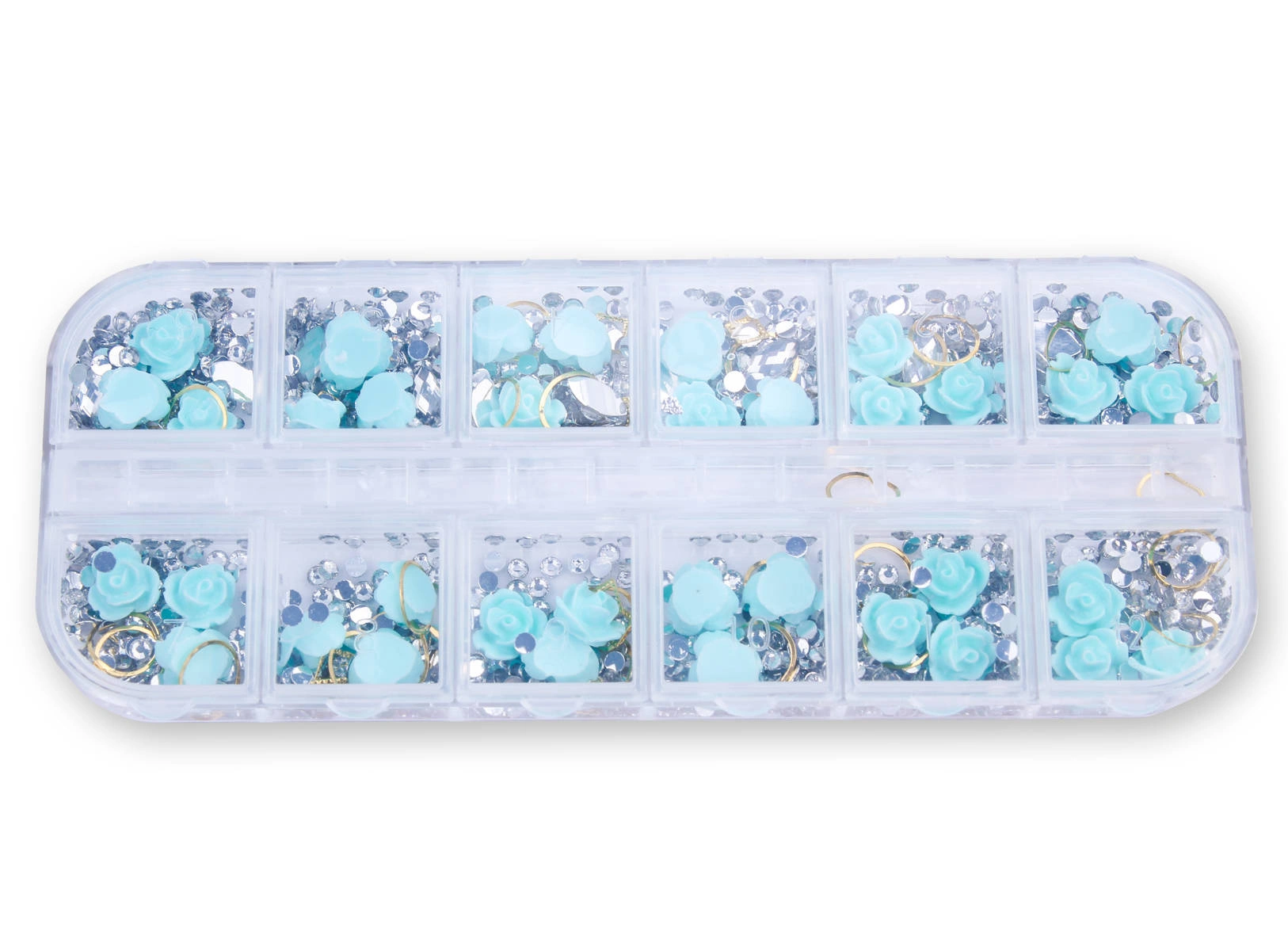 Zestaw zawiera 12 przegródek z ozdobami, m.in. cyrkoniami, różyczkami, złotymi elementami.