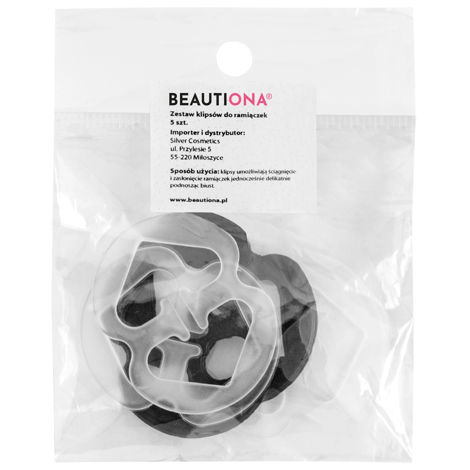 Zestaw zawiera 5 sztuk klipsów - 3 przezroczyste i 2 czarne. Wymiary: 45 mm x 35 mm
