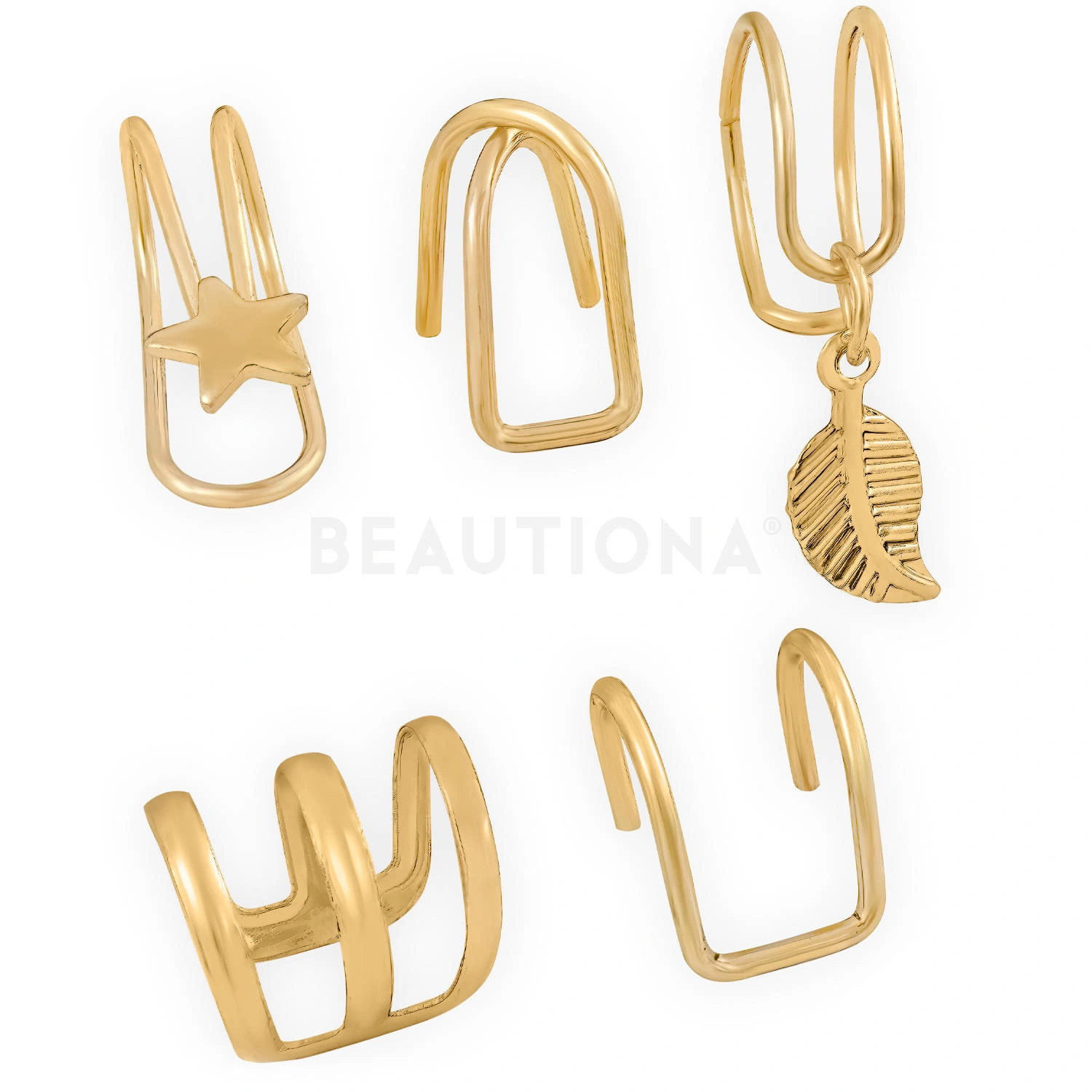 W zestawie znajduje się 5 różnych wzorów nausznic w kolorze złotym.