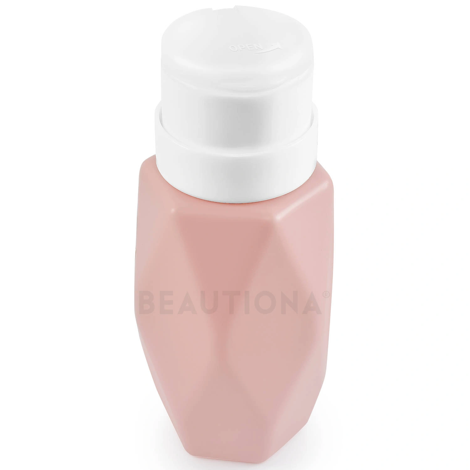 Pusta butelka w jasnoróżowym kolorze służąca do przechowywania płynnych preparatów do paznokci z wygodną, białą zatyczką.
