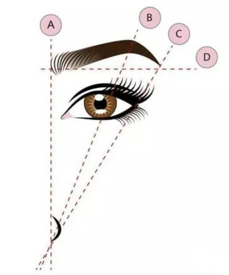Na miarce zaznaczono 3 punkty, niezbędne do wyrysowania odpowiedniego kształtu brwi - początek brwi (punkt A), łuk brwi (punkt B) i koniec brwi (punkt C).
