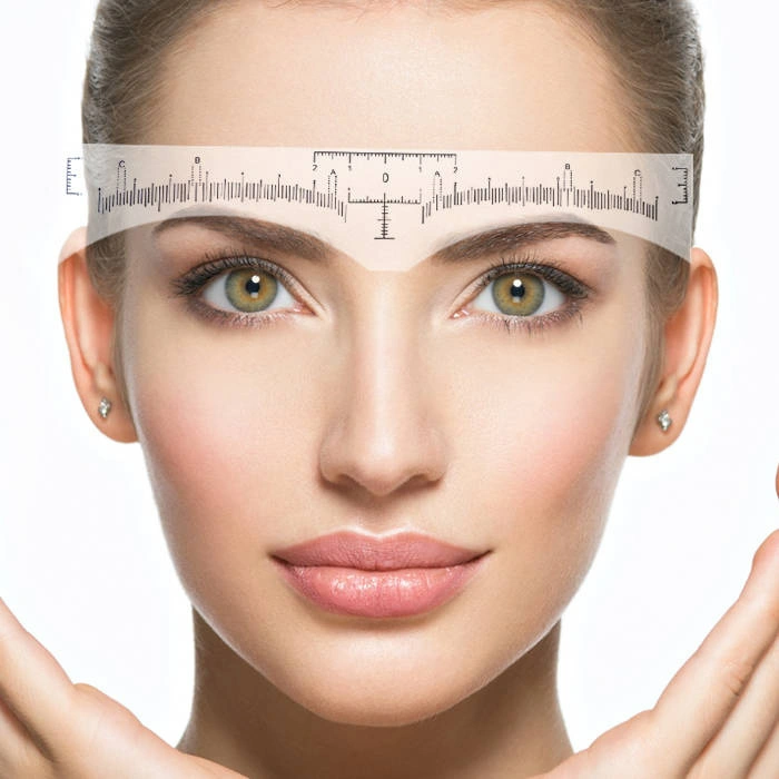 Aby skorzystać miarki do brwi, należy umieścić ją na grzbiecie nosa, tak aby była równoległa do niego, a następnie zmierzyć odległość między brwiami.