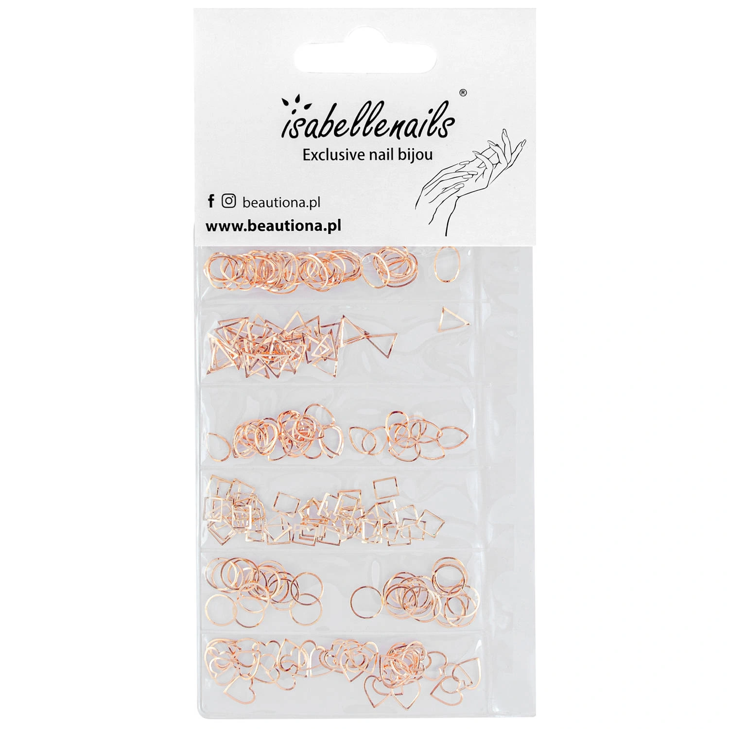 Mix geometrycznych ozdób do paznokci w kolorze różowego złota nadadzą każdemu manicure klasy, szyku i elegancji.