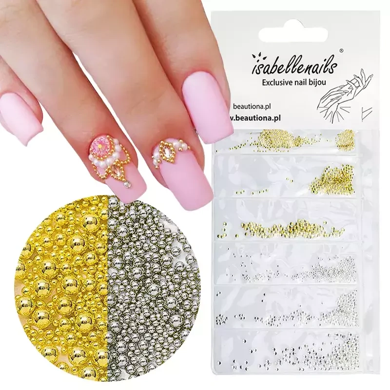 Zestaw trzech rozmiarów kulek w dwóch odcieniach pozwoli na wykonanie wielu przeróżnych zdobień, które będą pełniły funkcję biżuterii na paznokciach.